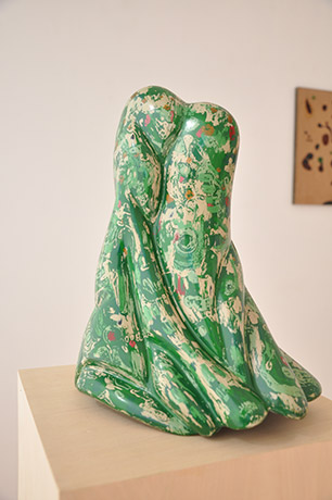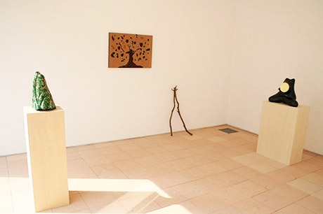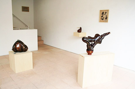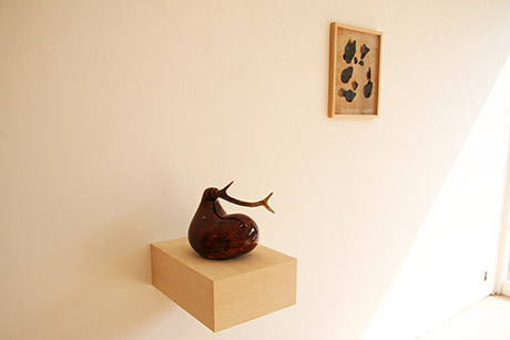 Someya produces his art works by applying dry-lacquer technique, building the base with clay, covering its surface with lacquer and borrowing motifs from the figure of objects or livings.