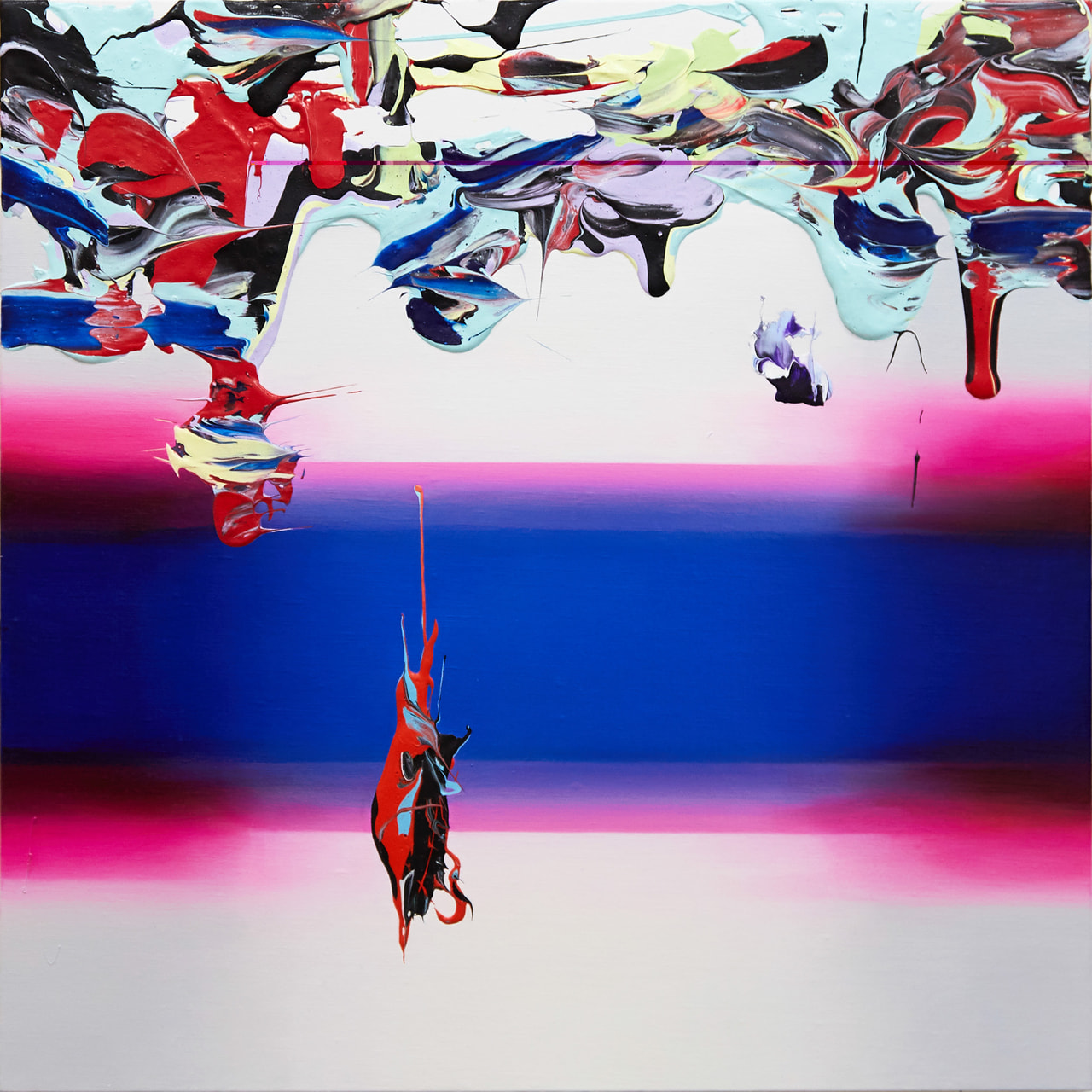 Wanting to visualize ‘time standing still’ on the canvas in the form of a painting, I experimented by incorporating dynamic motifs into the static canvas as contrasting elements to make it more obvious that time is standing still in resulting painting. In my art, fluid paints and memories are dynamic images, while the canvas itself is a static motif. I interpret memories as dynamic entities because I believe that memories are a made-up, artificial world in which fragments of reality and preconceptions mix together, overlap, and are made to conform to our view of life over the passage of time, thereby forming the unique memories of each individual. In other words, I interpret things this way because I think that human memory is full of holes, like a strainer used to drain off water, and continually changing within our heads.