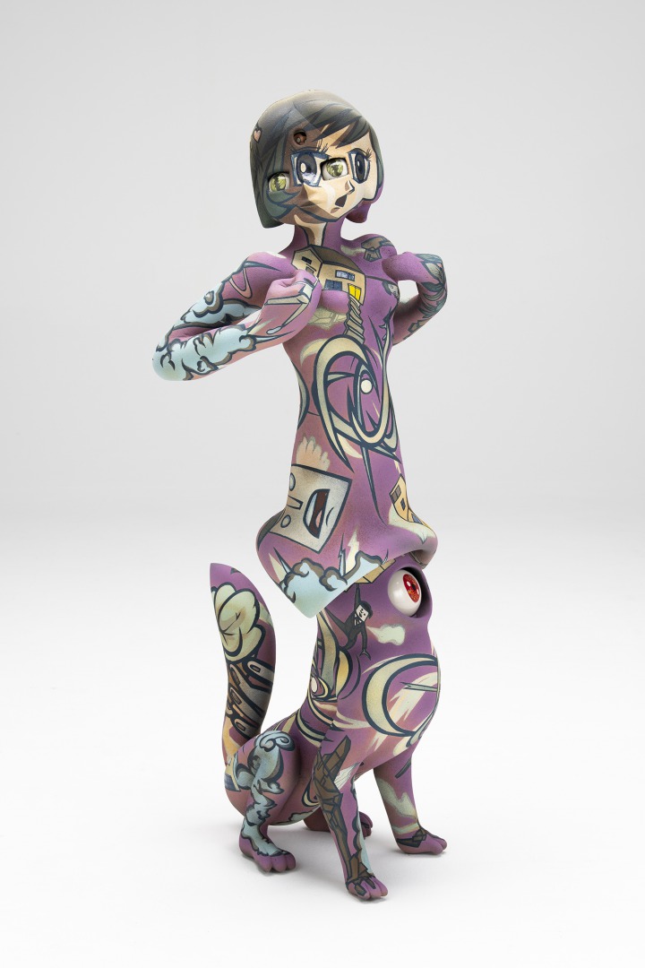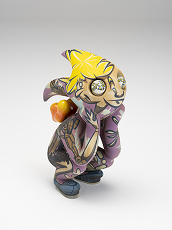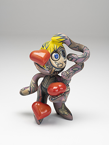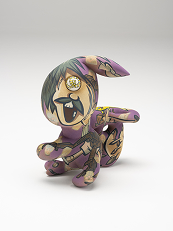 生命体とも言い切れない存在。頭部、胴体、手足のようなパーツはデフォルメされ歪み、触手のようにしなやかに伸び、分裂し変態しながらもバランスを保ち立つ。表面のイメージもまた同様の特色を持ちつつ、かたちに寄り添いながらもブレてまた反復する。このように日野田崇の作品群には、歪み、デフォルメ、ブレと反復という特徴が顕著である。これらの特徴が、立体というかたち、イメージ、展示される場に、絡み合いながら展開する。