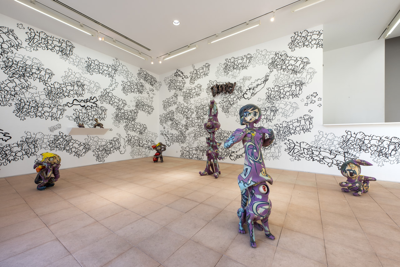 日野田は自身の制作過程の別の影響要素として音楽を挙げる。ジャンルにこだわらず即興的なものを好み、そこで体得する感覚を重要視する。なるほど、フリースタイルなリズム、グルーヴに自らの直感を乗せ、土に直接手で触れ、成形、色を施し、素材との交信を重ねる過程で、時に無意識も意識するかのように、記憶や経験と身体とが一体となり、立体というひとつの姿へと変貌をとげる。この勢いは立体に留まらず、台座、床、壁面へと展開する。この時、日野田は与えられた場の内にイメージをレイアウトしなければならない。だが視点を変えれば、この構成により展示空間は、四方八方にぶつかり跳ね返るリズム、叫び、そのエコーの増幅と拡散の場と化すのだ。このように捉えると、歪み、デフォルメ、ブレと反復は、予定調和に収まりきらない、より動的なるものの連鎖の表れである。