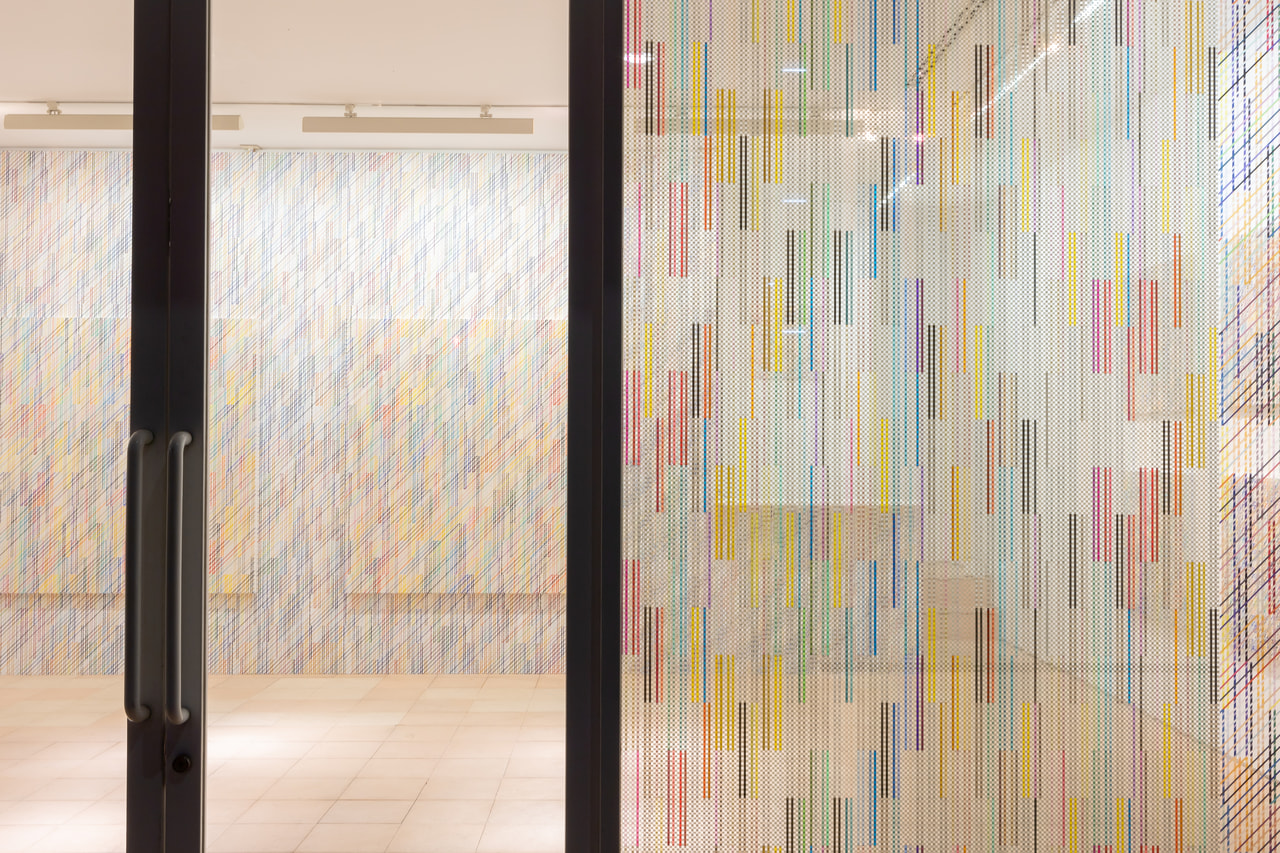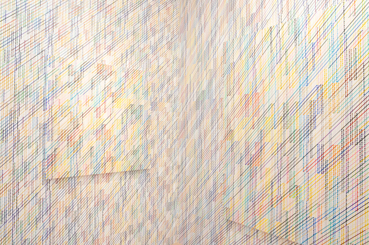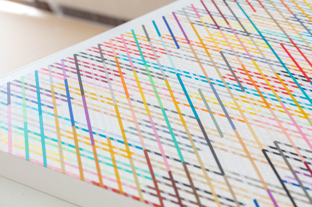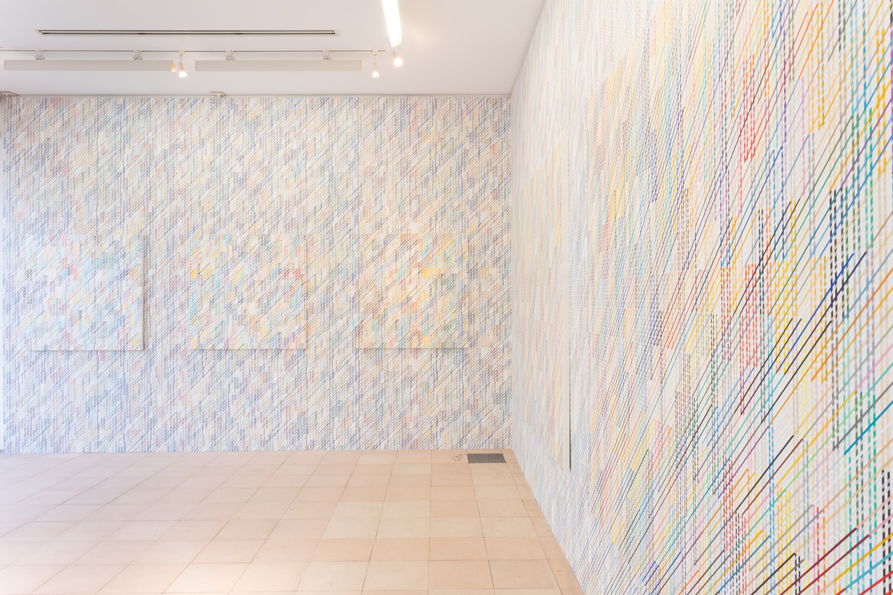 As you examine the work in this show from different distances and angles, I hope you enjoy the shifts that occur in the image through the innumerable perpendicular and diagonal lines that have been individually divided and painted. I want you to look at the threads that have not yet been woven and imagine a textile that only you can see.