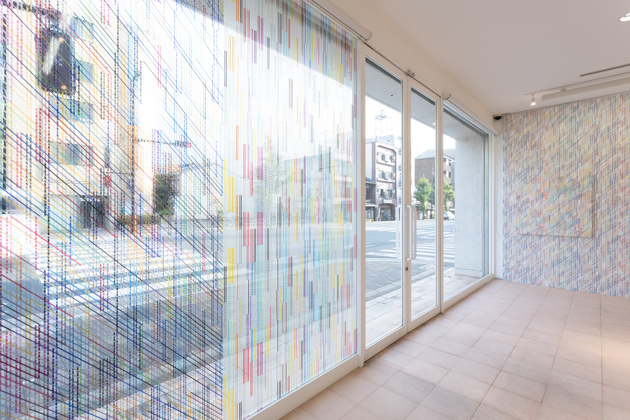 本展では、これまでのグリッドに斜め45 度の線の重なりが試みられた新作12 点に加えて、壁紙を使用したインスタレーション形式で展覧いたします。観者は展示空間への出入りにより、作品による揺らぎを体感する事ができるでしょう。ぜひ会場でご高覧ください。