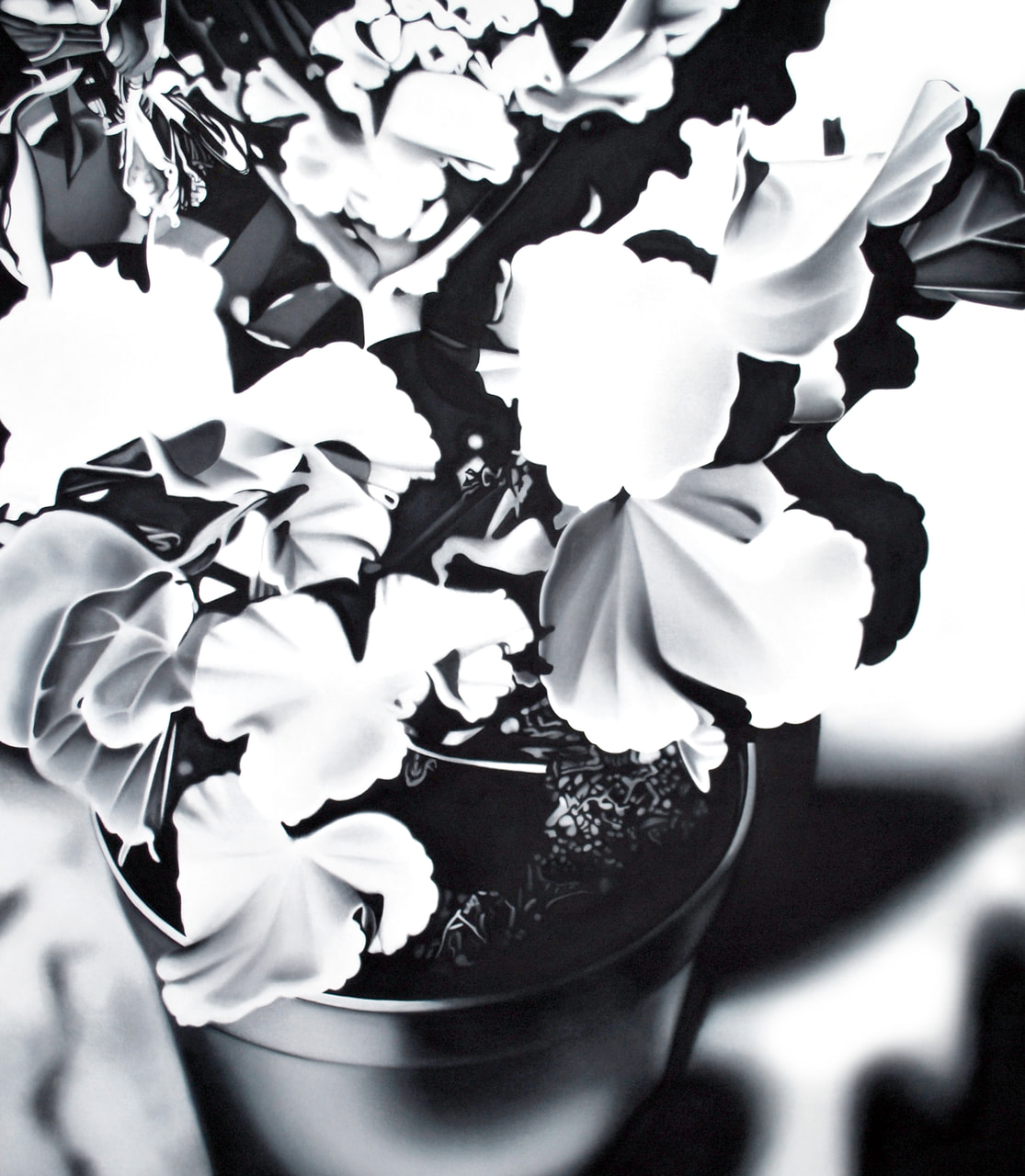 Attempting to express the radiance of life, I have often chosen flowers as motifs. In Madrid, I was enthralled by the forms of geraniums, which were probably the flowers that I saw most of. Returning to Japan, I began a new project, beginning by growing the flowers to be painted.