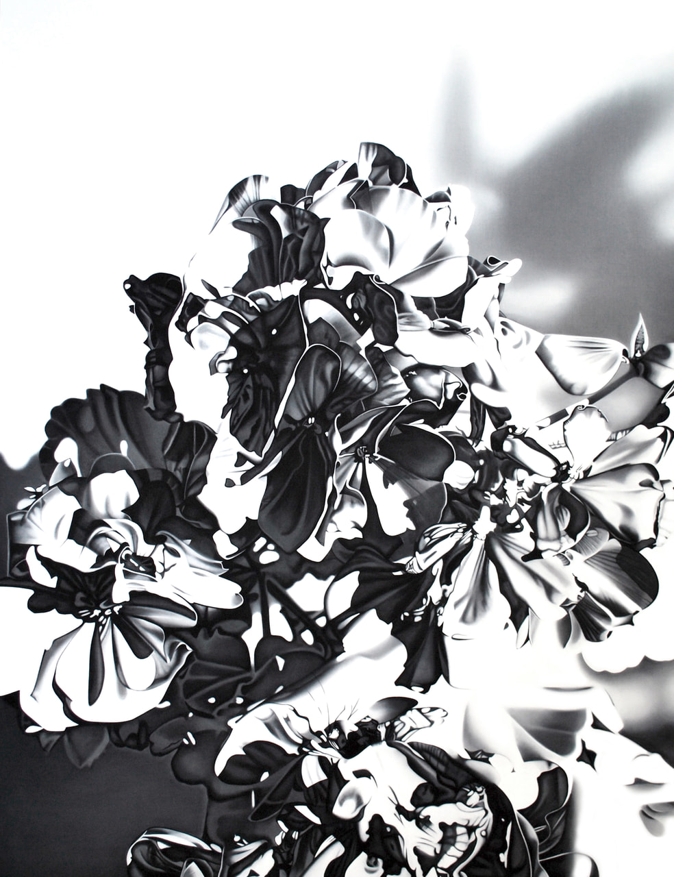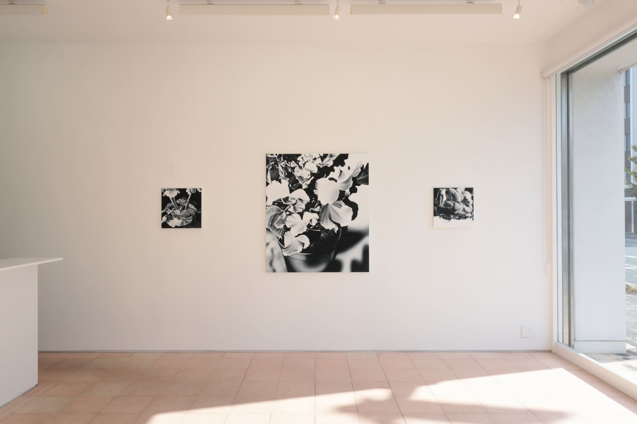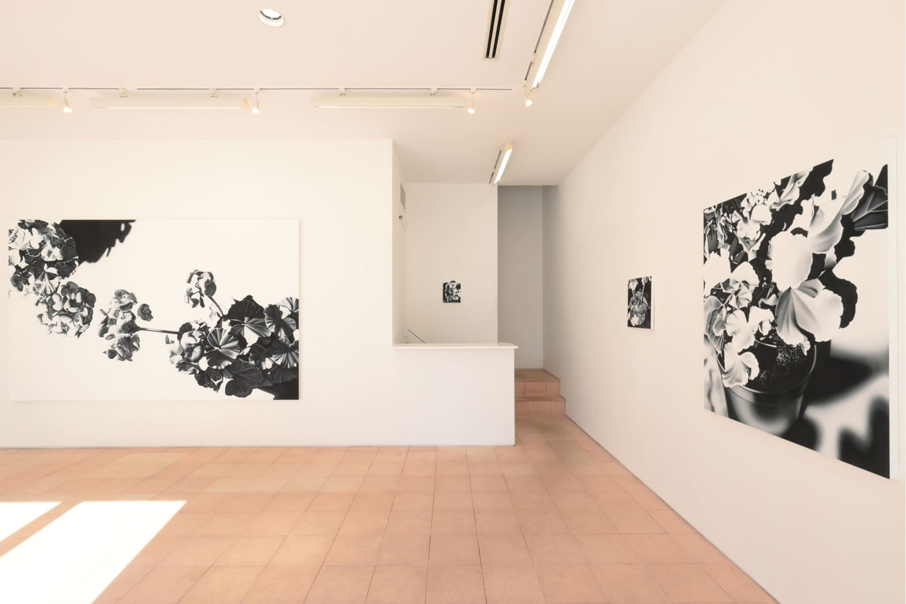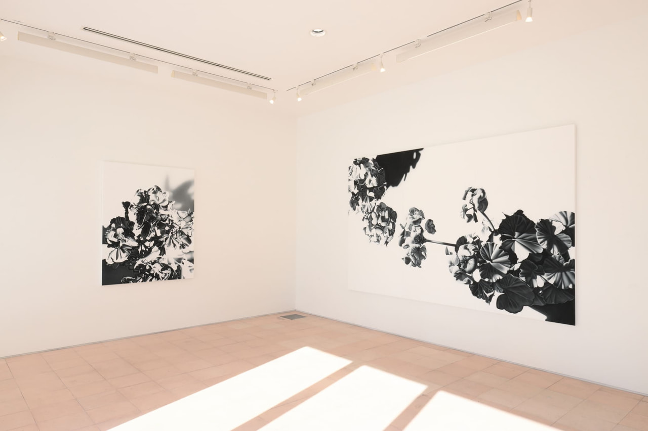 This exhibition at imura gallery was first presented in Tokyo in November 2021. It comprises six works by the artist in total, including additional new works. The expression of light based on white and her carefully produced black paint produces a vigor like that seen in the life cycles of plants. The geranium motifs take over the space, resulting in a highly satisfying exhibition.