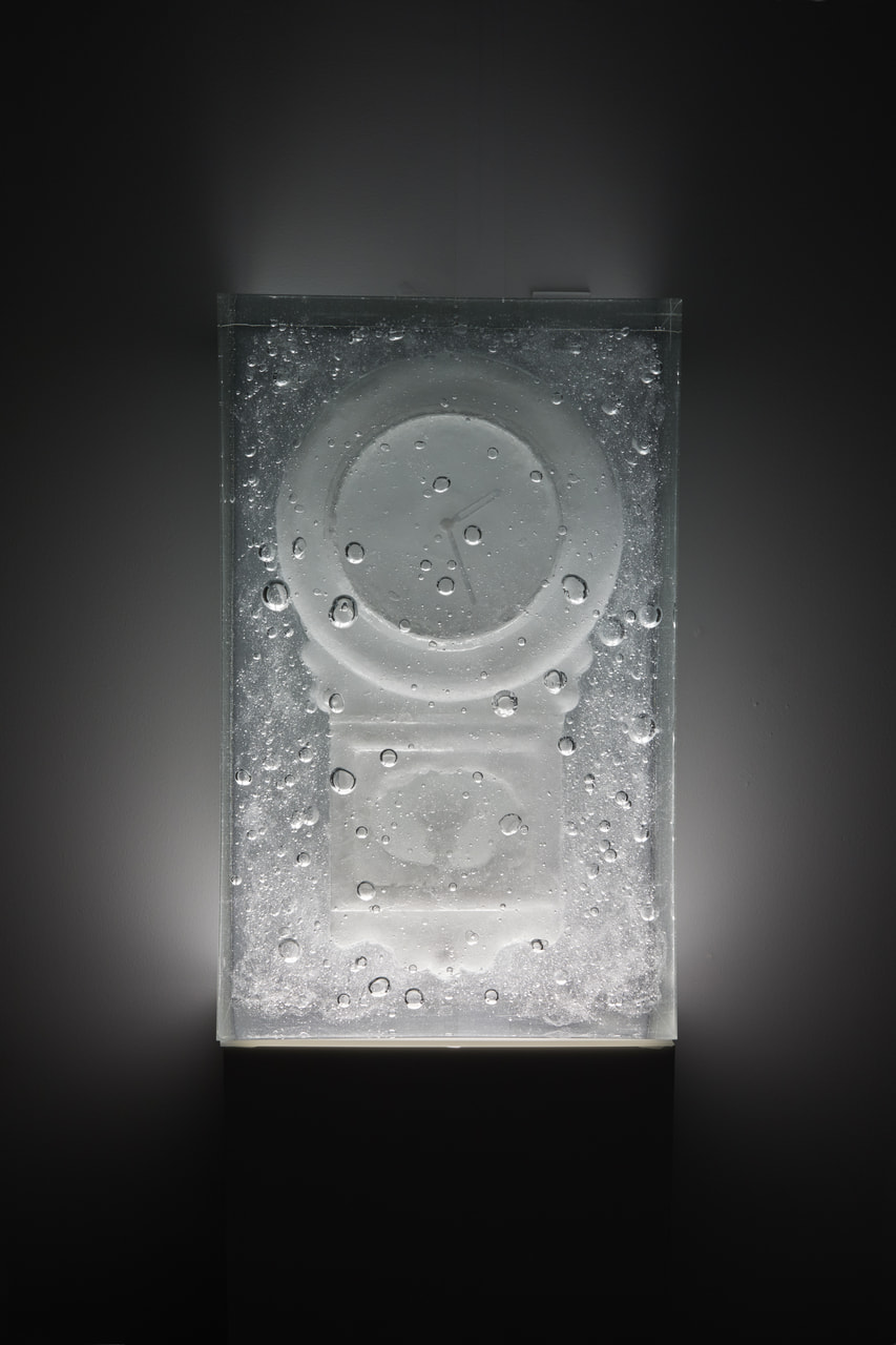 Waiting for awakening –wall clock– is a work in which a clock made of naphthalene is encased in transparent resin, with a single small hole. As long as the hole is sealed, the clock rests quietly inside the resin. But when the seal is broken, the work slowly wakes up as it comes into contact with the air. The air bubbles in the work are the result of Miyanaga's process of pouring the resin into the piece layer by layer, trapping the air in place.