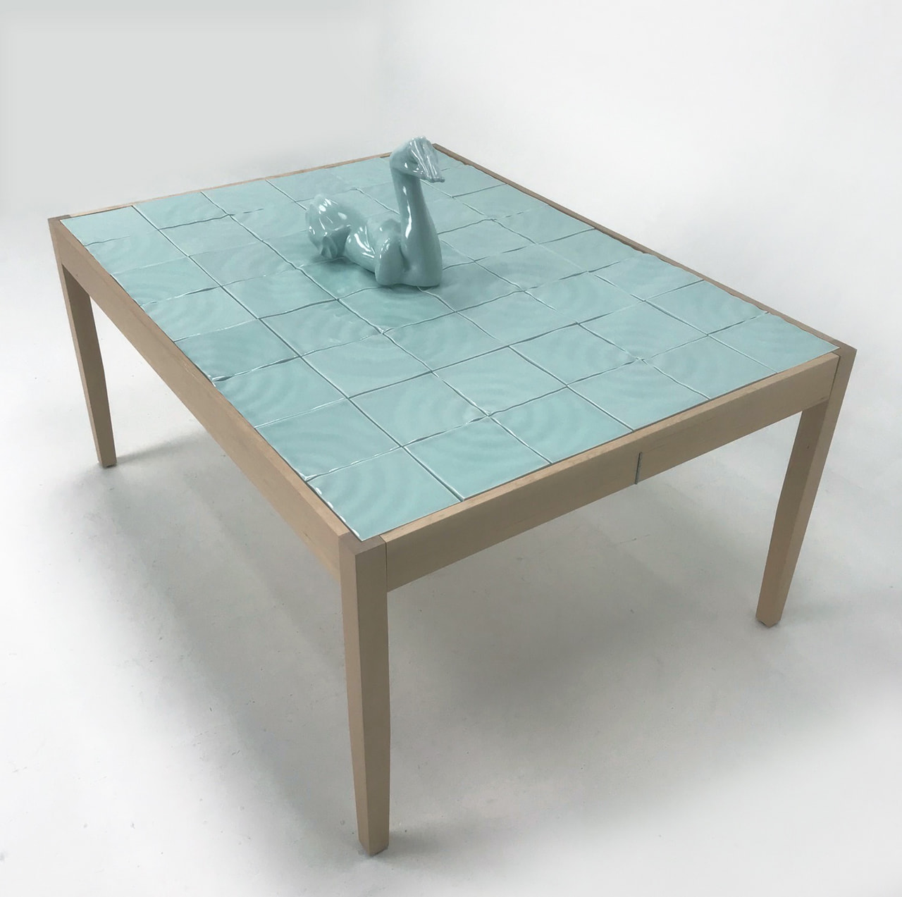 本展では、作品の中心に青磁の水鳥と波紋タイルを据えた、ミクストメディアによる立体作品《Celadon・Lake 翠い湖》 、《 Celadon・A Water Bird on the Pool》 と、青磁の水鳥の写真画像を使用したシルクスクリーン版画作品など、新作9点を展覧いたします。今回の展示構成の主となる「青磁の水鳥と波紋タイル」は、成形に3Dソフトやプリンターを用い、また出力されたプラスチック製の水鳥/タイルを手作業で成形し、その後型取り、粘土を鋳込み、乾燥させ、素焼き、本焼きと、複雑な制作プロセスを経て、完成された作品です。かつて家業であった陶器屋、粟田焼への思いも寄せて制作された新作を、是非ご高覧ください。