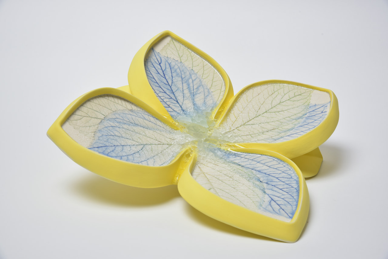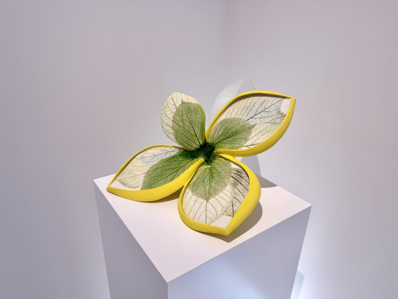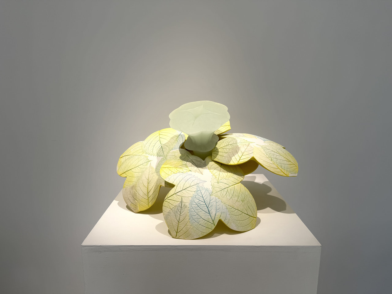 This exhibition will present mainly new works fit for the season—from late spring into the monsoon period. Yellow-hued flowers occupy the center of the space, the inside of their petals full of water as they stretch out towards the abundance of life. The crazing that occurs due to varying shrinkage in the pottery and glass seems to engrave the passage of time on the surface of the work, as if whispering the age of the material. The freshness created by the transparency of the glass, together with the soft, bright yellow of the stoneware, makes the expression graceful yet full of powerful vitality.
