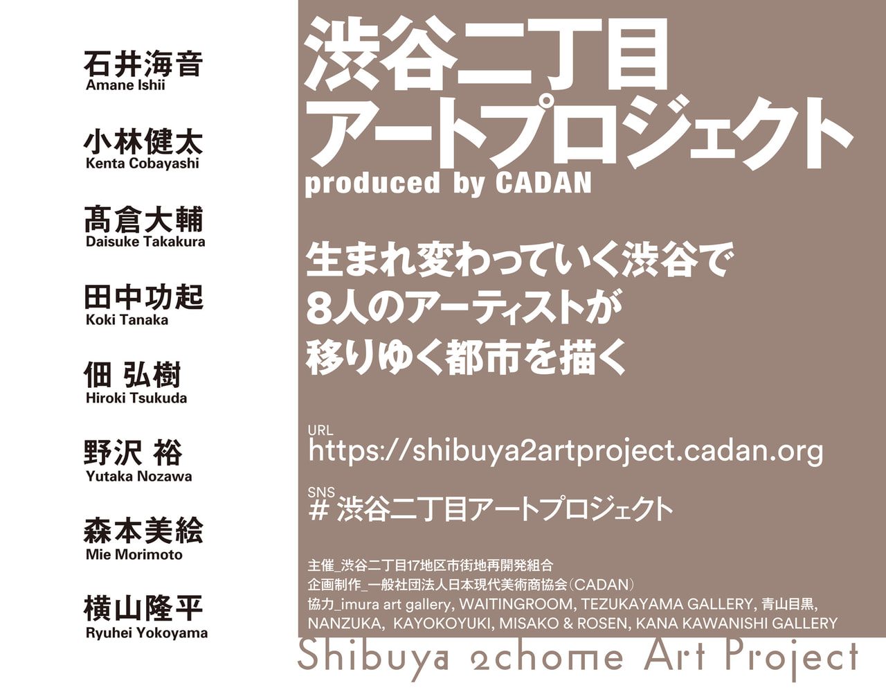 現在、渋谷〜青山エリアを繋ぐ渋谷二丁目17地区、渋谷駅東口エリアでは、地上23階建ての複合施設の建設が進んでいます。その建設現場の仮囲いに、この度、CADAN(一般社団法人日本現代美術商協会)から「都市の移り変わり」をテーマに選出された現代アーティスト8名によるアート作品が登場します。